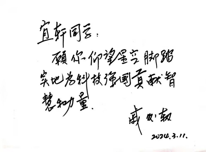 2024年,何宜轩作为学生代表与中国工程院院士、神舟飞船首任总设计师戚发轫交流。戚院士亲笔为他写下寄语:“要仰望星空,脚踏实地,为实现科技强国贡献自己的智慧和力量。”这几十个字,成为何宜轩创业路上的精神坐标。
