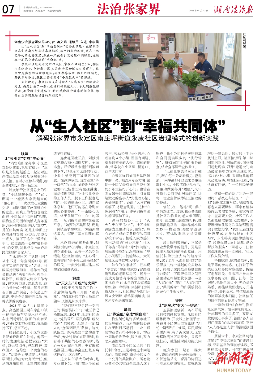 从“生人社区”到“幸福共同体”需要走多远?在张家界市永定区南庄坪街道永康社区,这个问题的答案,藏在一位交警的角色转变里,藏在一床被套引发的暖心调解里,更藏在一笔笔公开晾晒的“明白账”里。