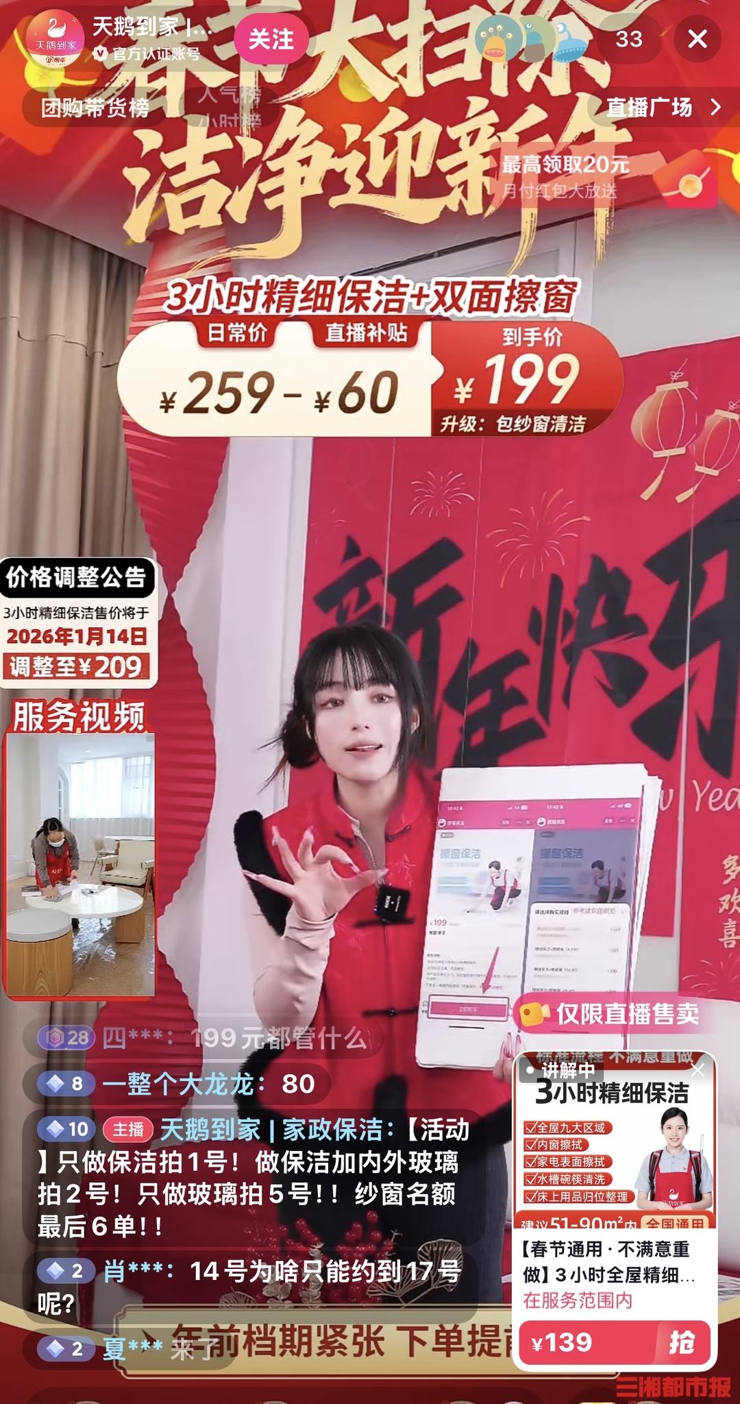 记者注意到,社交平台的家政直播间也成为预订主战场。天鹅到家官方直播间内,3小时精细保洁加双面擦窗、纱窗清洁服务售价199元,主播不断提醒“1月14日将涨价至209元,建议先拍后约”。而据天鹅到家官方直播间数据,该平台按房屋面积定价,99元—209元的套餐涵盖内窗擦拭、全屋清洁等基础服务,其中51—90平方米小户型3小时精细保洁139元,实时已售897份,近30天销量过万,累计销售70万单。