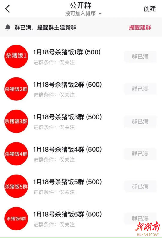 网友@灿灿子表示,没想这个邀请也同样受到网友热捧,截至12日15时,她建的6个“刨猪汤群”(每群500人)全部加满,还有人在不断加入新群。网友自发按地域组成了小组,最远的是辽宁组,湖南本地的则分成了长沙、衡阳、娄底等组。