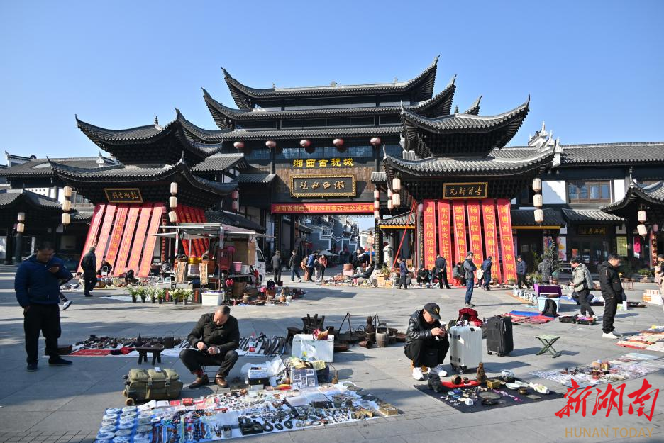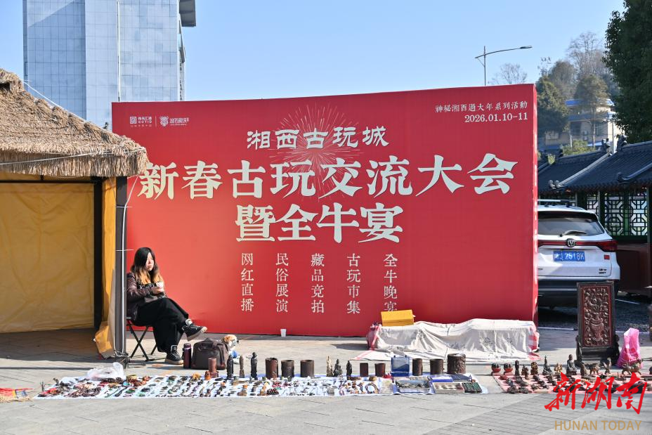 新湖南客户端1月13日讯(通讯员 黄俊力 向松)1月11日,笔者来到湘西土家族苗族自治州吉首市湘西秘境·湘西古玩城,近距离感受新春古玩交流大会暨全牛宴。本次活动是“神秘湘西过大年”系列活动之一,设置古玩市集、藏品竞拍、民俗展演、直播推介与全牛晚宴等板块,打造一场集文化、艺术与烟火气于一体的新春盛会。