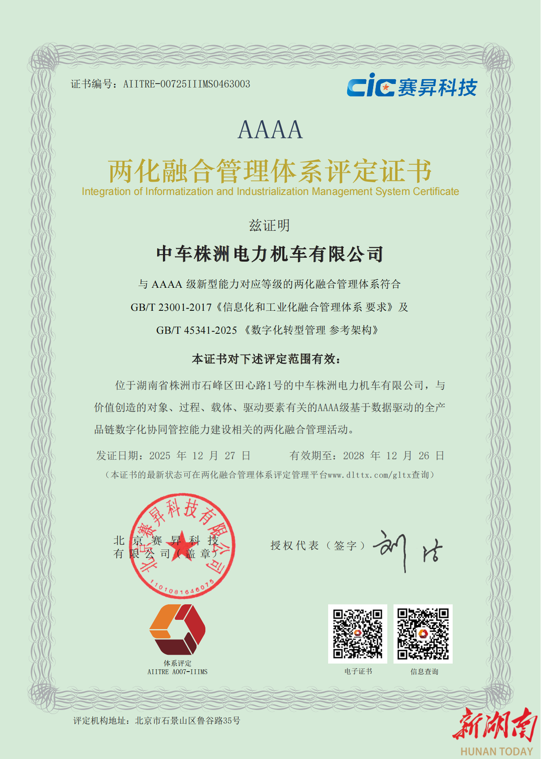 湖南日报·新湖南客户端1月13日讯(通讯员 戴曦铭 徐向林)近日,中车株机公司正式获得由国家工信部主导推动、国家认监委批准评定的 “两化融合管理体系AAAA级证书”与“数字化转型管理体系AAAA级证书”,成为全国第二批获证单位之一。这标志着公司在信息化与工业化深度融合、全面数字化转型方面获得国家权威双重认可,正式跻身行业数字化转型标杆行列。