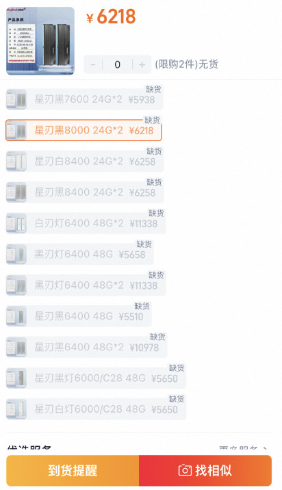 此外,他发现该品牌的所有内存条价格都大幅上涨,不少商品还显示缺货。侃财君在某电商平台上查看,发现不少品牌的内存条显示缺货。