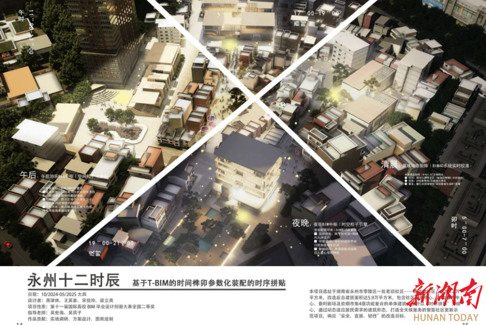 竞赛赛场中,蒋津林同样表现亮眼。在第十一届国际高校BIM毕业设计创新大赛中,她带领团队聚焦永州老旧社区改造,提出“基于T-BIM的时间榫卯参数化装配”设计方案。团队以“时序拼贴”为核心,将一天划分为四个时段对应设计四座功能单体,构建可重组功能模块适配居民多元需求。她主动承担两座核心单体的深化设计与AI渲染工作,多次赴现场调研优化方案,最终作品斩获全国二等奖。