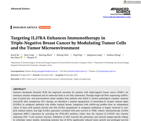 该研究由易文君教授、周慧博士与张丹华副教授共同指导,徐家墀博士后为第一作者,湘雅二医院为第一完成单位。团队表示,未来将继续探索针对IL27RA的精准干预方式,在提升疗效的同时尽可能减少对机体的影响,推动研究成果向临床实践转化。