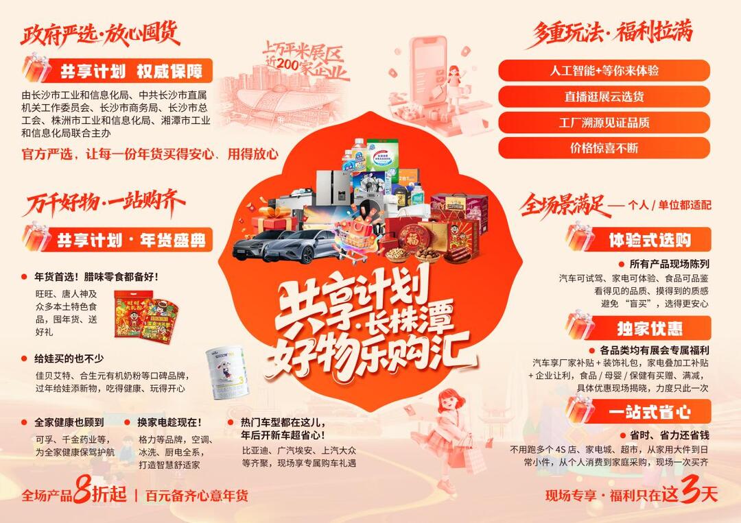 1月16日至18日,由长沙市工业和信息化局、中共长沙市直属机关工作委员会、长沙市商务局、长沙市总工会联合打造的“共享计划”长株潭好物乐购汇,将在长沙红星国际会展中心举行!这场精心筹备的年货盛宴,设置180多个展位,品类涵盖汽车、家电、食品、医药、保健品等,为广大市民带来省心、放心、划算的一站式年货采购体验,让新春年味提前“上线”。