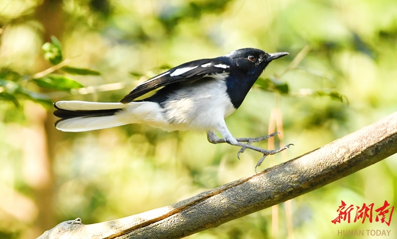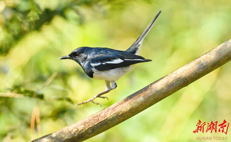 1月12日,长沙岳麓山,鹊鸲在枝头时而休憩,时而跳跃。鹊鸲又名“四喜鸟”,雄鸟上半部黑色,翼部具显著白色斑块,下体前黑后白;雌鸟上体灰褐色,下体白色。鹊鸲主要栖息于村落旁的果园、菜地、灌丛、稀疏树林,以昆虫为食,偶尔也会摄食小型脊椎动物和植物果实。 湖南日报全媒体记者 徐行 摄