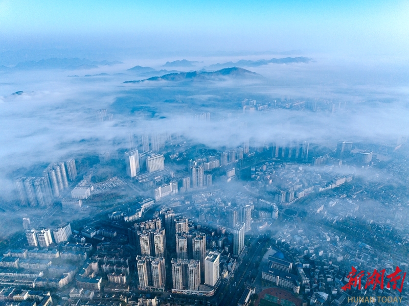 1月13日,吉首市乾州城区上空出现平流雾景观。流动的平流雾笼罩楼宇山峦,为城市增添诗意朦胧,绘就冬日唯美画卷。 彭璟 摄(湖南图片库)