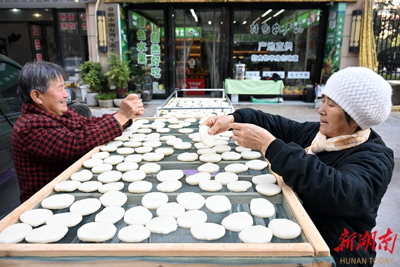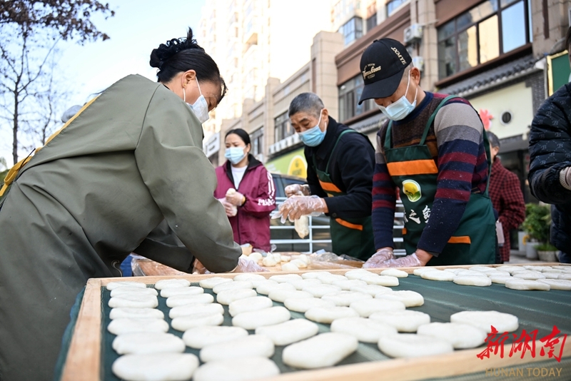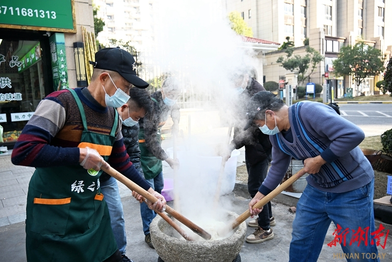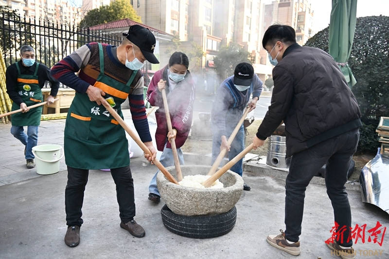 1月13日,澧县澧阳街道新河社区碧桂园小区门口,居民们在专业人员指导下体验传统手工打糍粑。入冬以来,当地绿之鲜特产店将传统打糍粑“搬”进县城,让居民在“家门口”就能感受传统年俗、购买正宗年货。柏依朴 摄(湖南图片库)