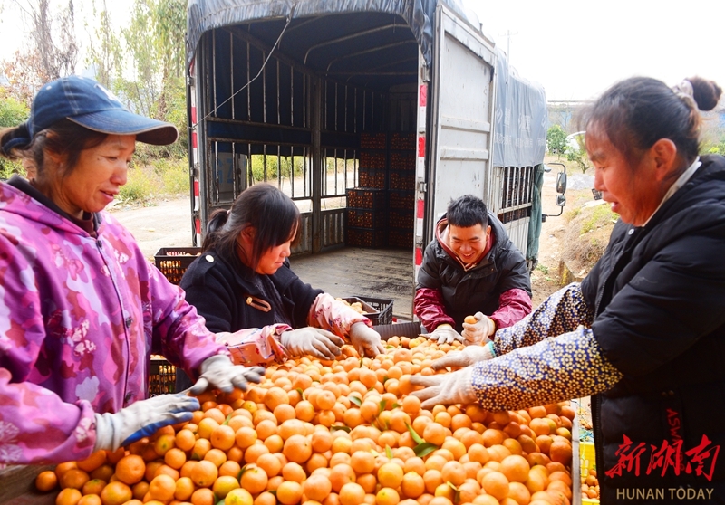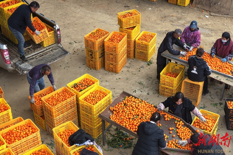 1月13日,嘉禾县珠泉镇沙坪村,村民在分拣、装运砂糖橘外销。时下,该村600多亩砂糖橘迎来丰收季,村民忙着采摘、分拣、装车,供应市场。黄春涛 摄(湖南图片库)