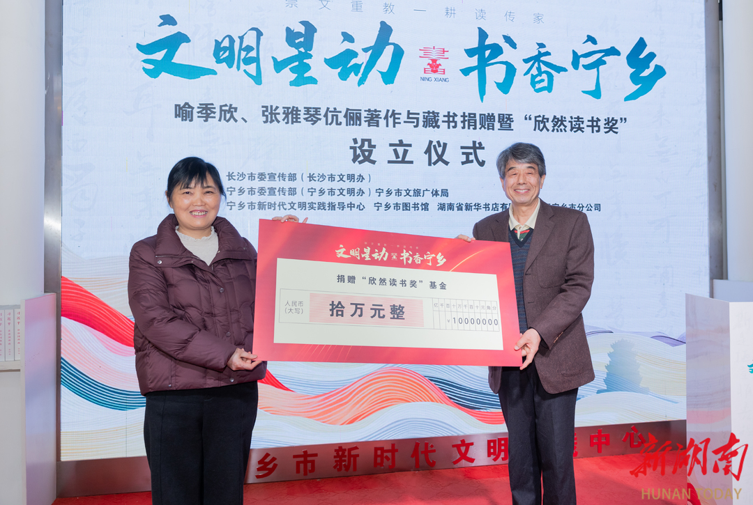 湖南日报·新湖南客户端1月13日讯(记者 李曼斯 通讯员 魏寒零)1月12日,宁乡市新时代文明实践中心暖意洋溢,“文明星动·书香宁乡——喻季欣张雅琴伉俪著作与藏书捐赠暨‘欣然读书奖’设立仪式”在此举行。来自广州的喻季欣、张雅琴将其珍藏的1200余册著作与藏书无偿捐赠予宁乡市图书馆,并捐资10万元人民币设立“欣然读书奖”活动基金。