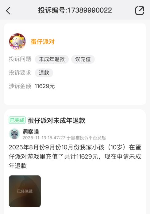 投诉平台上显示的是消费者方的说法,涉诉具体金额等现实情况需要更多信息进行佐证,但也从一个侧面说明未成年人充值退款难的现象问题。