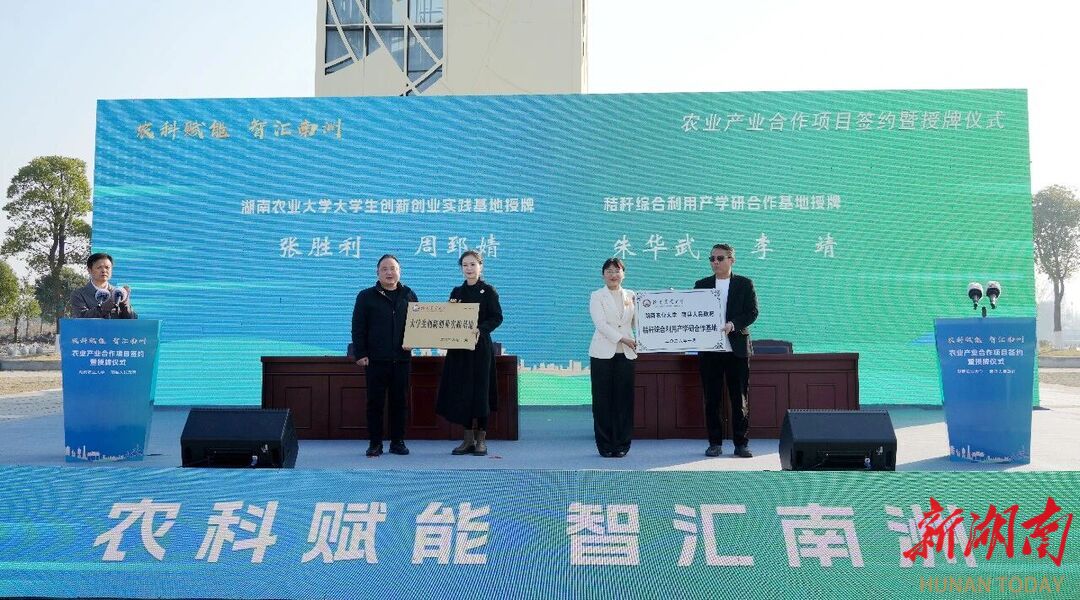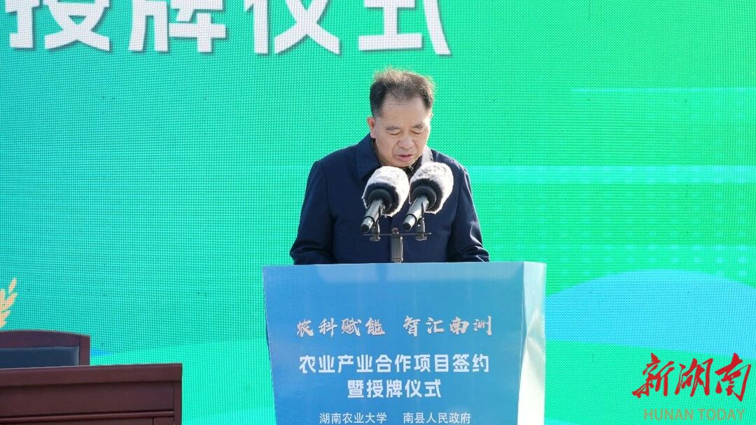 湖南日报·新湖南客户端1月14日讯(通讯员 张燕 王征洋)农科赋能,智汇南洲。1月13日,南县人民政府与湖南农业大学农业产业合作项目签约暨授牌仪式,在南县生态稻虾广场举行。中国工程院院士、湖南农业大学党委副书记、校长邹学校,湖南农业大学党委委员、副校长杨国顺,南县县委书记钟剑波出席。