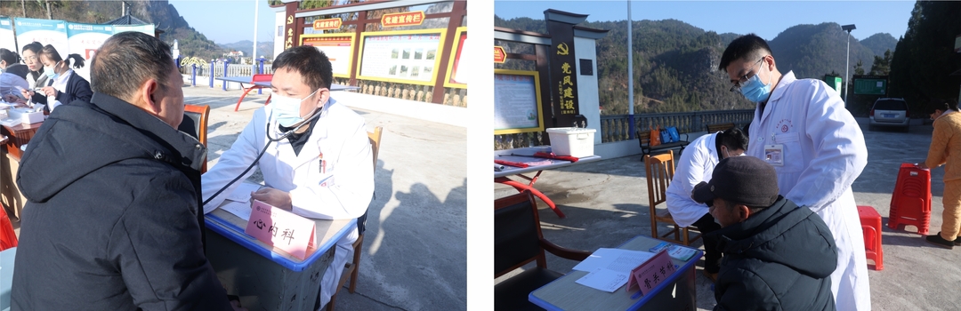 ▲内科二党支部书记、心血管内科二区主任、主任医师谢喜中,关节外科主任、主任医师梁振扬为村民检查身体