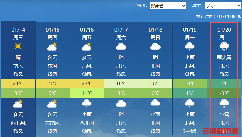 记者查询中央气象台发现,1月16日至20日,我国黄河、长江之间区域过程累计降温有可能达到20℃以上,最高气温几乎是满20减20。湖南大部处于此次核心降温区域,长沙22℃→0℃,16日最高气温22℃;20日最高气温仅在0℃左右徘徊,且最低气温降至-3℃,当天预报为雨夹雪转小雪。这也意味着长沙最快下周二迎降雪过程。
