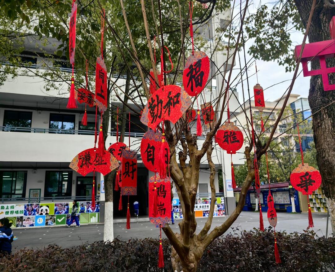 每一件作品,都是独一无二的艺术创作,更是孩子们对汉字之美、文化之韵的独特解读。教学楼前、长廊两侧、树梢枝头,挂满了孩子们的书法文创作品,在冬日暖阳的映照下,成为校园美丽的风景线。(陈玲)