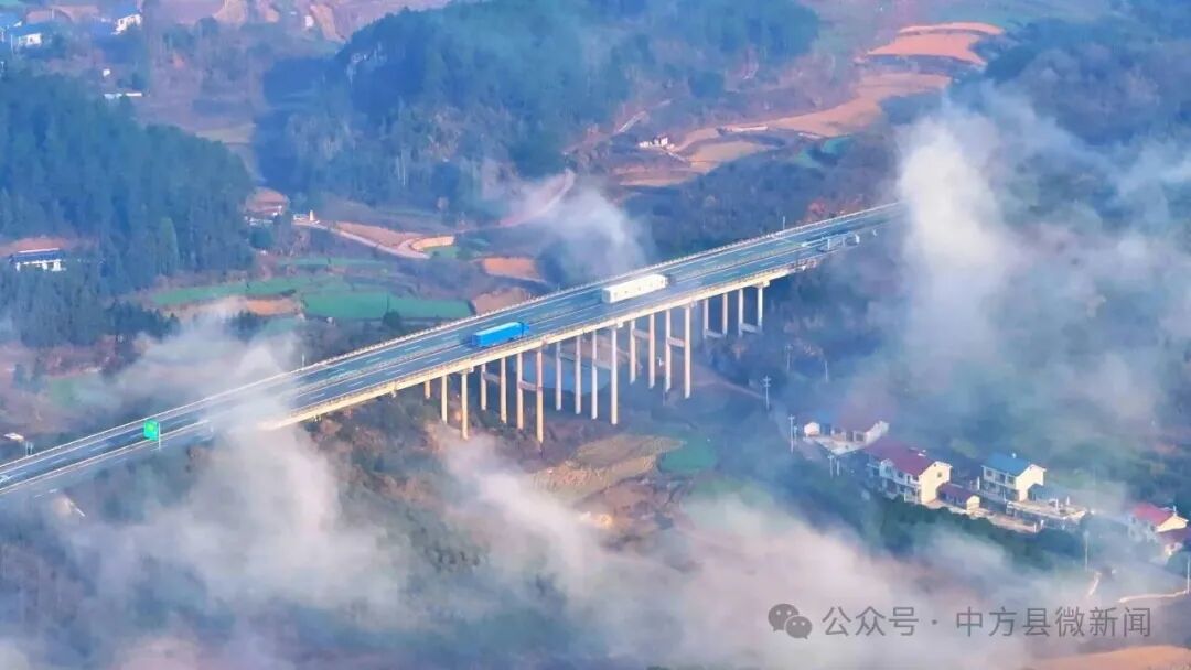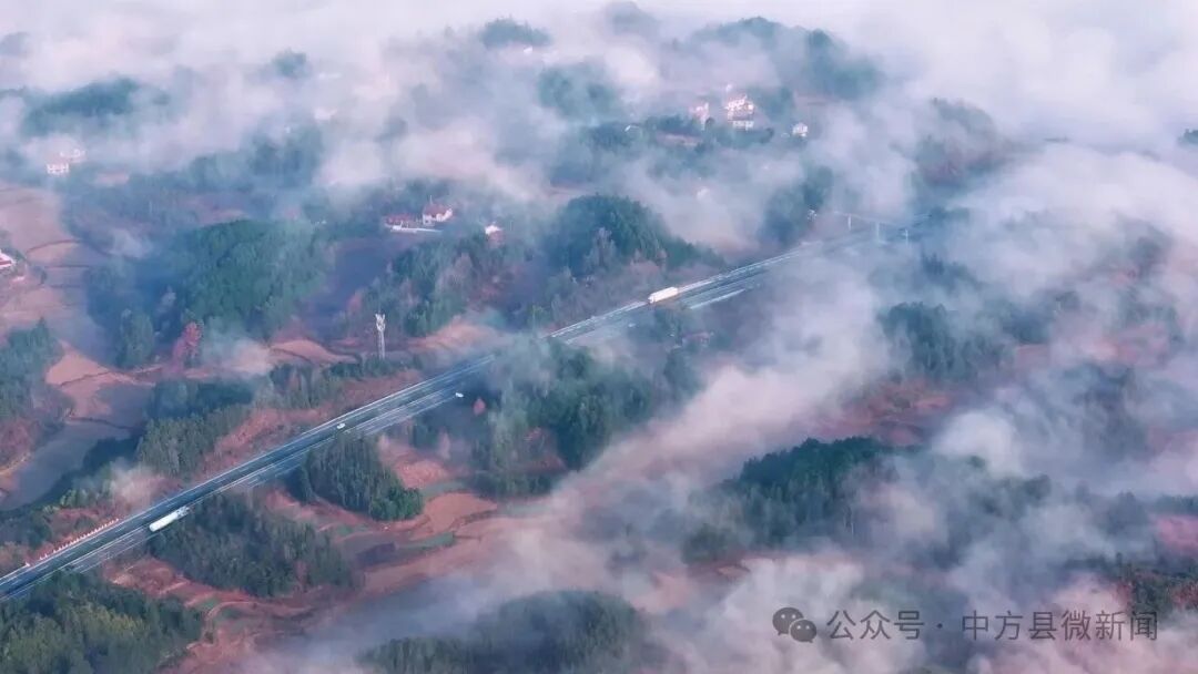云海翻涌间,高速公路如银带穿梭其中,车流隐约可见,在缥缈雾气里勾勒出灵动的线条;云雾时而升腾、时而舒展,在山峦间肆意流淌,将错落的村落轻轻掩映,屋舍轮廓在云雾中若隐若现,添了几分朦胧婉约的诗意。远山、公路、村落与流动的云雾相融相依,一步一景,美轮美奂,宛如人间仙境。