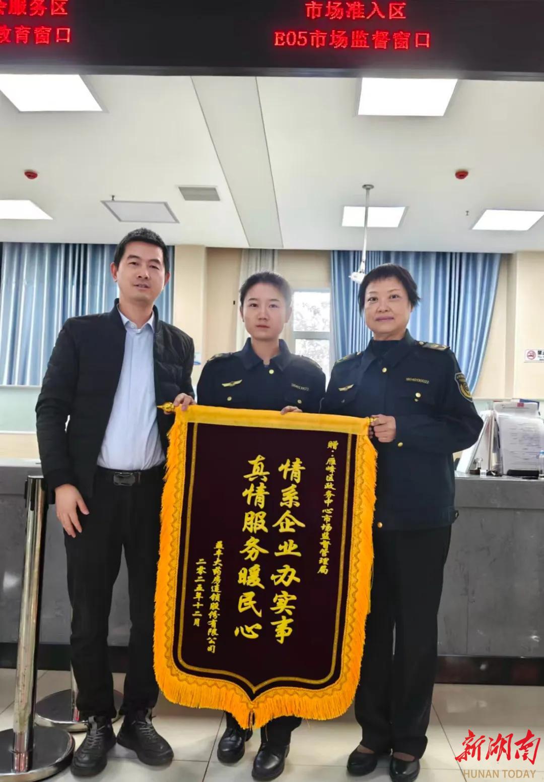 湖南日报·新湖南客户端1月14日讯(通讯员 黎丽)近日,雁峰区政务服务中心市场监管行政审批窗口迎来暖心一幕——益丰大药房连锁股份有限公司负责人专程送来一面书写“情系企业办实事,真情服务暖民心”的锦旗,对窗口工作人员高效、贴心的服务表达由衷感谢。这面锦旗,不仅承载着企业对市场监管工作的肯定,更是雁峰区持续优化营商环境、提升政务效能的生动见证。