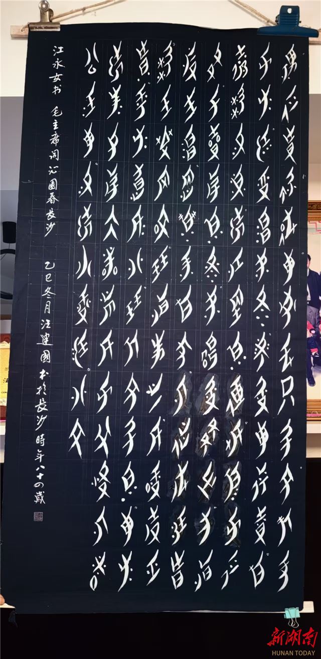 1月13日,汪建国的书法作品。书法家汪建国与崔国强开展艺术交流。这位八旬老人深耕传统八十余载,至今仍保持着每日5小时的创作习惯。汪建国五体皆精,在毛体书法、江永女书等领域潜心研究并有所感悟,其作品成为架起传统文化传承的多维立交桥,是文化交流的艺术纽带。 胡立强 摄(湖南图片库)