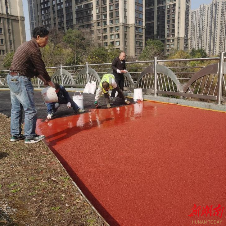 同年12月,龙王港人行道桥面改造工程悄然开始。“我们清除了桥面原有塑胶层,确保基层干净平整后,实施了整体防锈处理,随后进行沥青摊铺。”市政中心梅溪湖片区维护管理所所长王起文介绍道,“沥青铺设完成后,再对道路表层铺设陶瓷颗粒,以进一步提升路面的防滑性与耐久性。”