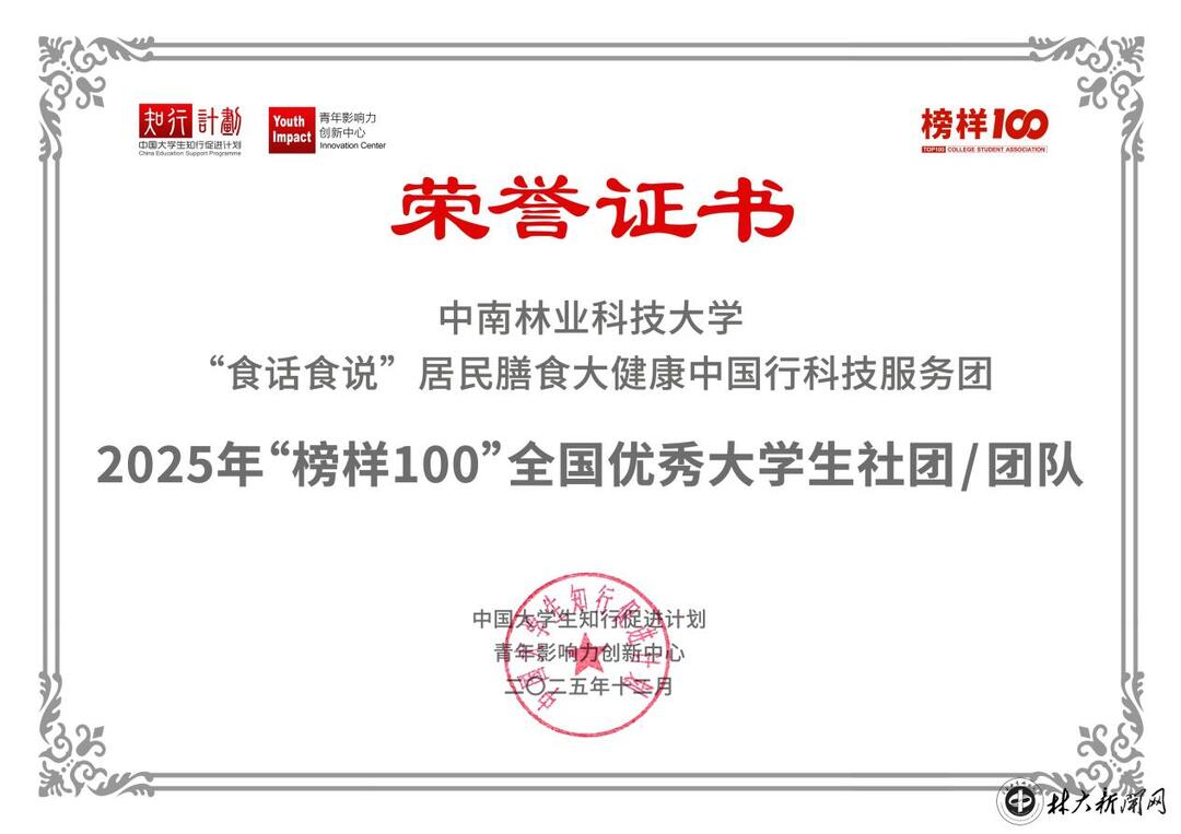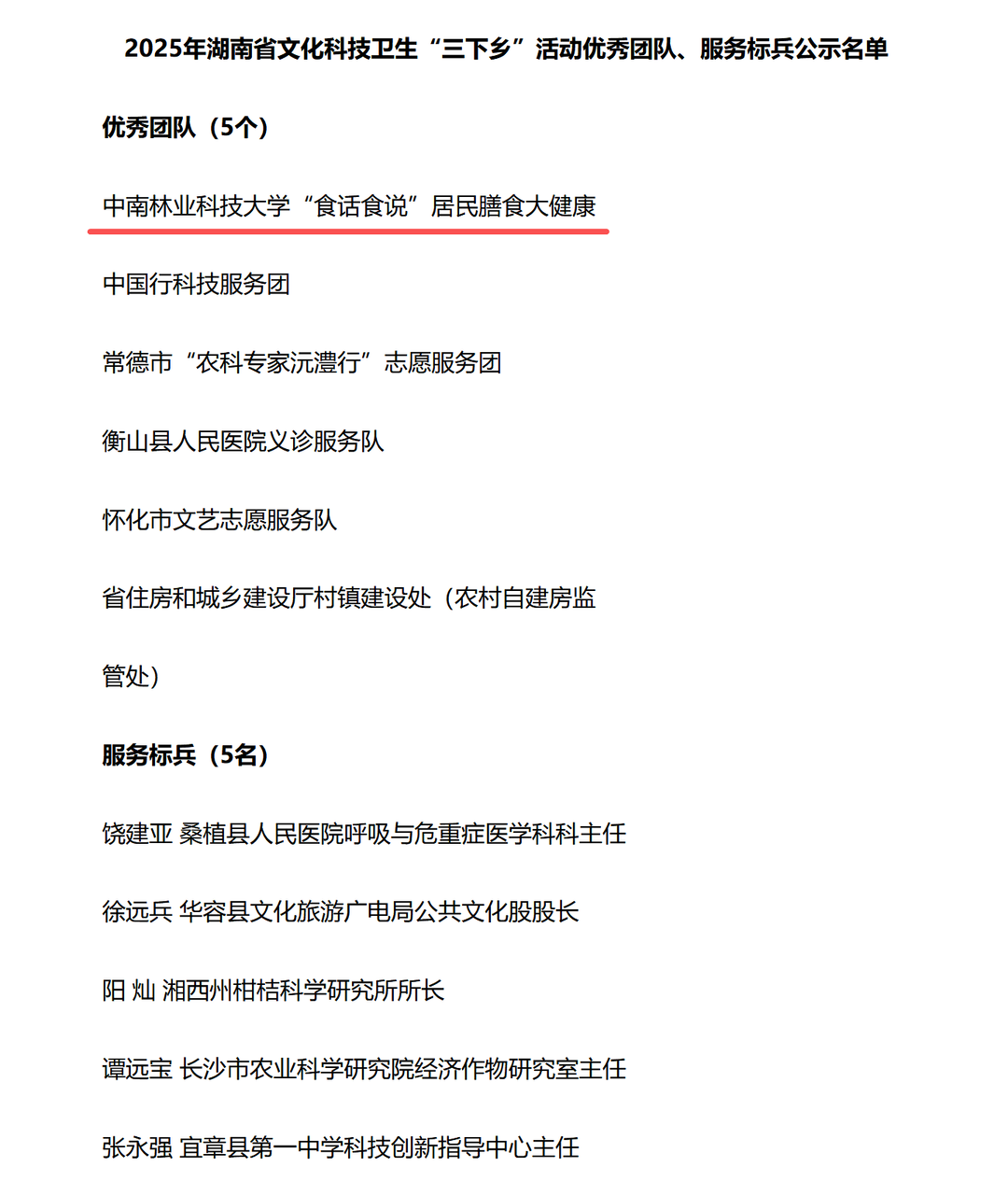 湖南日报1月14日讯(通讯员 李佳)近日,湖南省委宣传部公布2025年全省文化科技卫生“三下乡”活动评优结果,中南林业科技大学食品科学与工程学院“食话食说”居民膳食大健康中国行科技服务团荣获“优秀团队”称号,并入选“榜样100”全国大学生优秀案例。