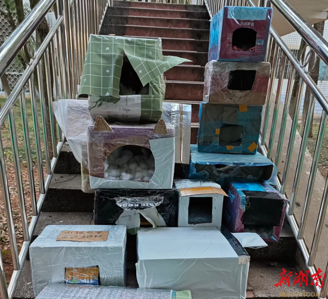 “冬天温度低,考虑到猫咪的保暖问题,我们制定了一个‘猫窝计划’,利用学生捐赠的棉服、衣物等等,为校园里60多只流浪猫们提供一个稳定热乎的家。”湖南农业大学TNR小队成员格林说,大家现正忙着收集泡沫箱,奔波运衣被,把散落的暖心物资汇聚。