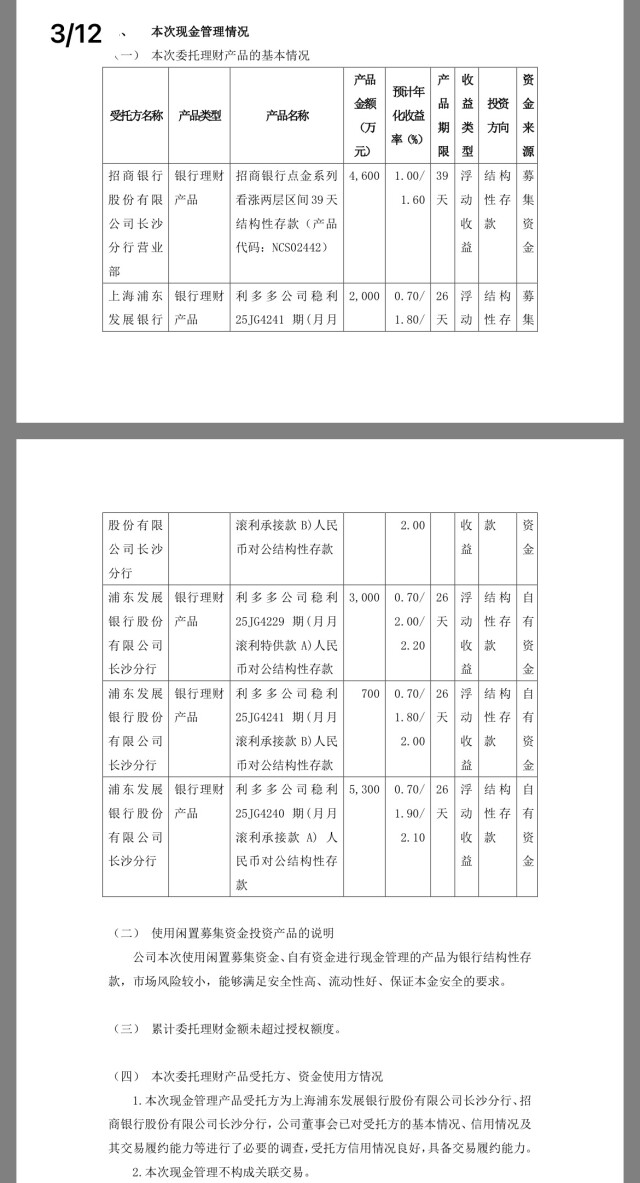广信科技公告显示,使用部分闲置自有资金9000万元进行现金管理,产品涵盖招商银行、浦发银行多款浮动收益的结构性存款,产品期限多为一个月左右的短期。