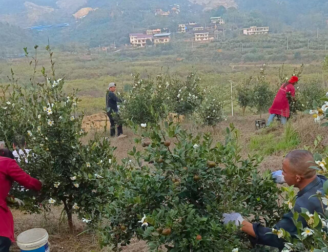 湘中腊月,山间寒意袭人。新化县桑梓镇的山岭间,却是一派火热的景象。300余亩油茶林层叠翠绿,工人们正忙着采收最后一茬茶果。
