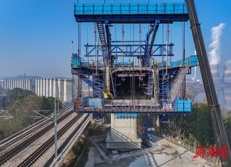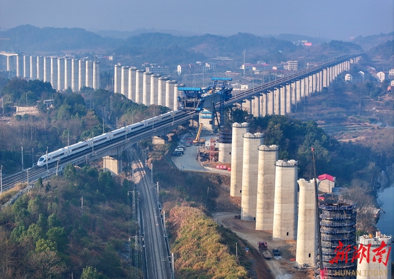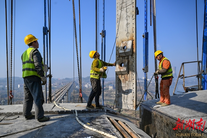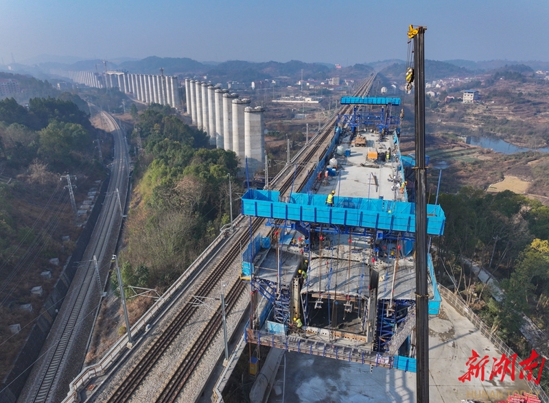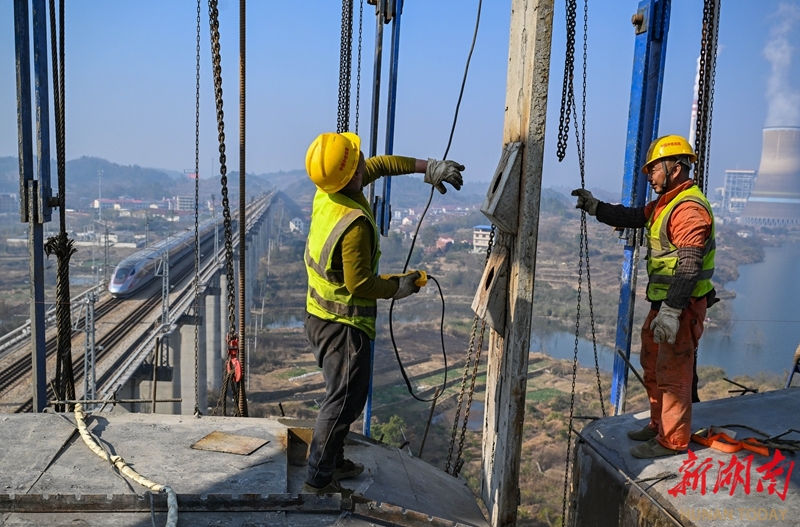 1月14日,工人在邵永高铁跨沪昆高速特大桥上施工作业。目前,由中铁四局承建的邵永高铁跨沪昆高速特大桥转体桥梁工程进入上部结构施工关键阶段,该桥为邵永铁路重点控制性工程之一。邵永高铁全长约96公里,设计时速350公里,是我国“八纵八横”高铁网中呼和浩特至南宁通道的重要组成部分。建成后,将对完善区域铁路网布局、促进中部地区高质量发展具有重要意义。湖南日报全媒体记者 郭立亮 通讯员 纪赛飞 摄影报道
