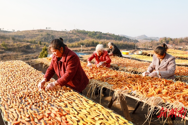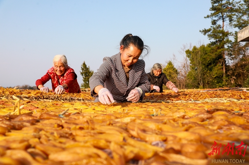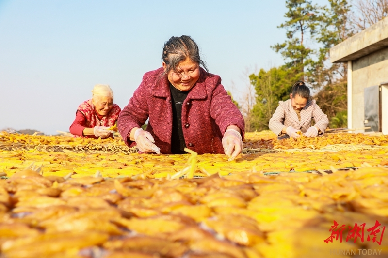1月14日,新田县枧头镇大观堡村,村民正利用晴好天气晾晒红薯干。近年来,该县充分发挥土壤富硒优势,大力发展以“云雾薯”为代表的优质红薯种植,并采取“公司+基地+农户”模式,将红薯产业纳入“一村一品”发展规划。通过加工成红薯干等特色农产品,并依托线上线下渠道销售,有效带动了村民增收致富。刘贵雄 陈祉凝 摄影报道(湖南图片库)