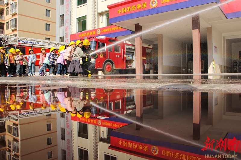 1月14日,小朋友在消防救援人员的协助下体验使用消防水枪。当天,新田县消防救援大队邀请辖区幼儿园开展“消防安全,从小抓起”宣传教育活动。小朋友们走进消防营区,通过参观装备、体验技能等形式,零距离学习消防知识,增强安全意识。 陆锦涛 摄(湖南图片库)