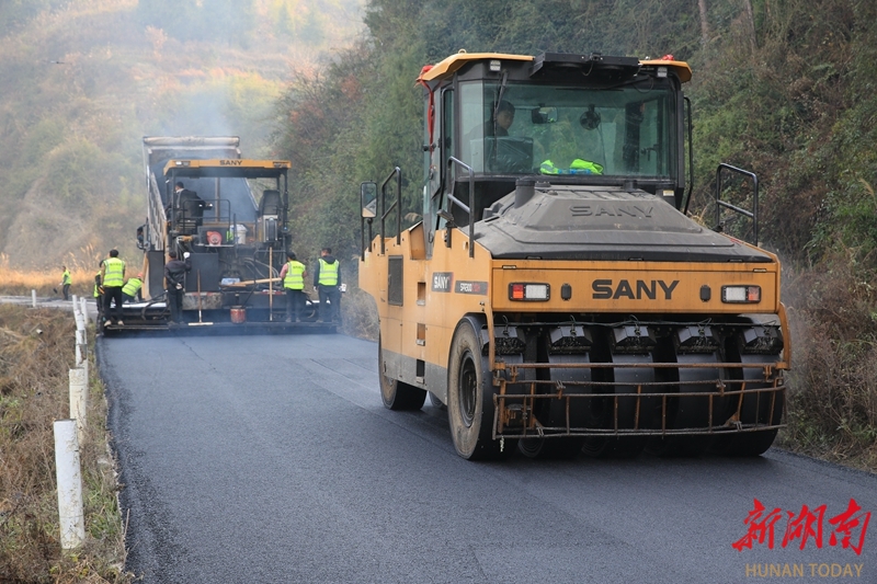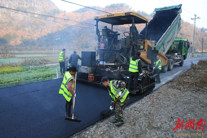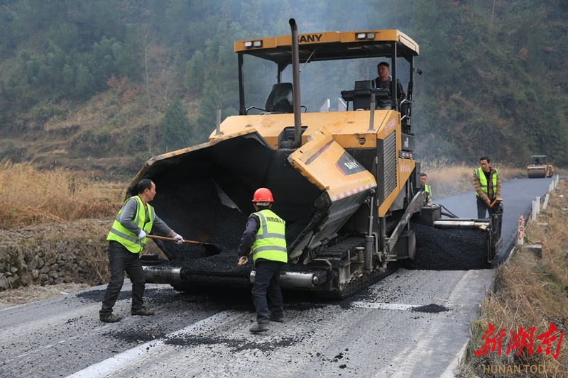 1月14日,龙山县召市镇三堡村,工人正有条不紊地进行柏油路面摊铺作业。近年来,该县大力推进农村公路升级改造,不仅改善了群众出行条件,更为当地经济发展注入了新动力。田礼成 摄(湖南图片库)