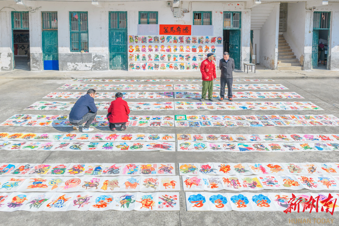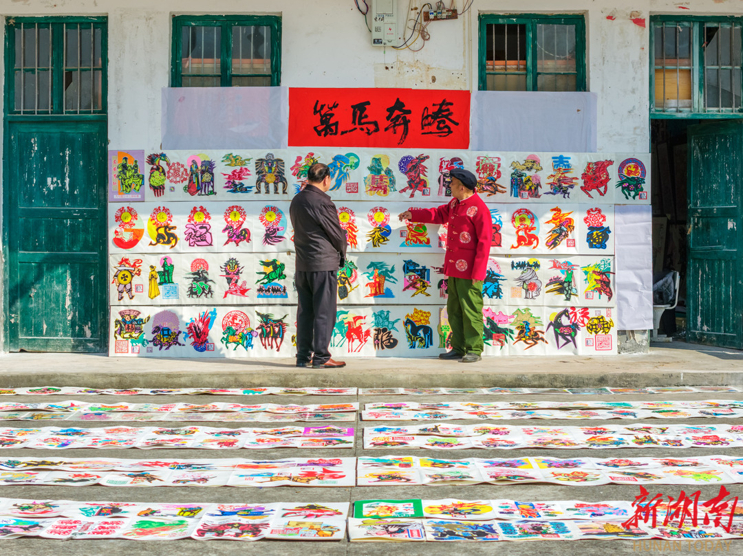1月14日,东安县端桥铺镇石坝村,村民驻足观看套色剪纸长卷作品《万马奔腾》。当天,宋兵前、唐戊雄夫妇历时16个月创作的套色剪纸长卷作品《万马奔腾》正式完工,为即将到来的农历马年献上了一份特殊的文化贺礼。该作品共32册,总长146米。宋兵前是湖南知名剪纸艺术家,五十余年来致力于剪纸创作和传承,其作品融合现代审美,形成了色彩绚丽、独具韵味的东安剪纸风格,并培养了大批剪纸人才。蔡小平 摄(湖南图片库)