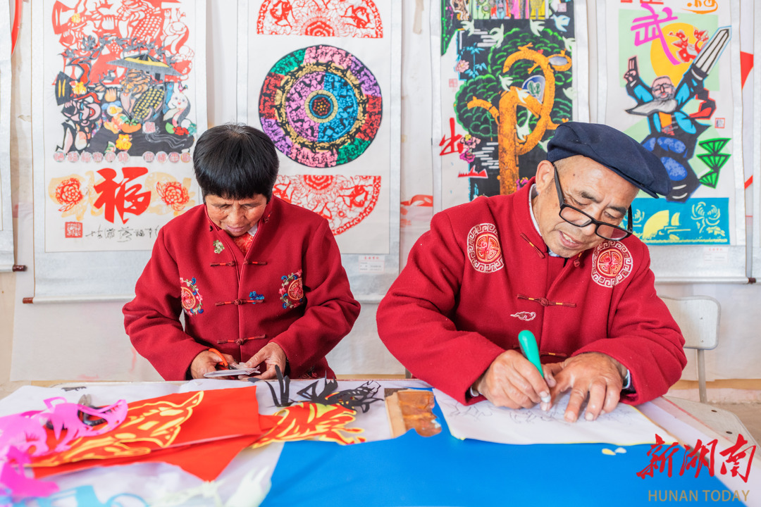 1月14日,东安县端桥铺镇石坝村,宋兵前、唐戊雄夫妇在创作套色剪纸长卷作品《万马奔腾》。当天,宋兵前、唐戊雄夫妇历时16个月创作的套色剪纸长卷作品《万马奔腾》正式完工,为即将到来的农历马年献上了一份特殊的文化贺礼。该作品共32册,总长146米。宋兵前是湖南知名剪纸艺术家,五十余年来致力于剪纸创作和传承,其作品融合现代审美,形成了色彩绚丽、独具韵味的东安剪纸风格,并培养了大批剪纸人才。蔡小平 摄(湖