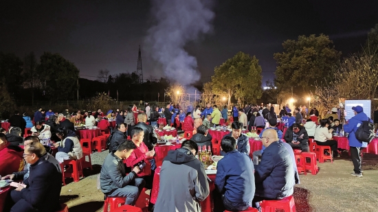 14日,永州市冷水滩区珊瑚街道水汲江社区居民准备好年猪饭,宴请江苏朋友,感谢他们对永州的宠爱和支持。