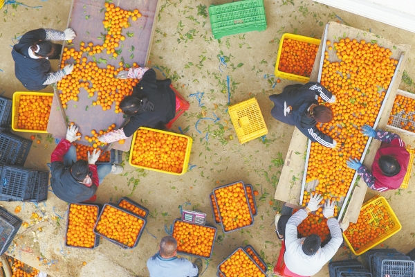 1月13日,嘉禾县珠泉镇沙坪村,村民在分拣、装运砂糖橘。时下,该村600多亩砂糖橘迎来丰收季,村民忙着采摘、分拣、装车,供应市场。黄春涛 摄(湖南图片库)