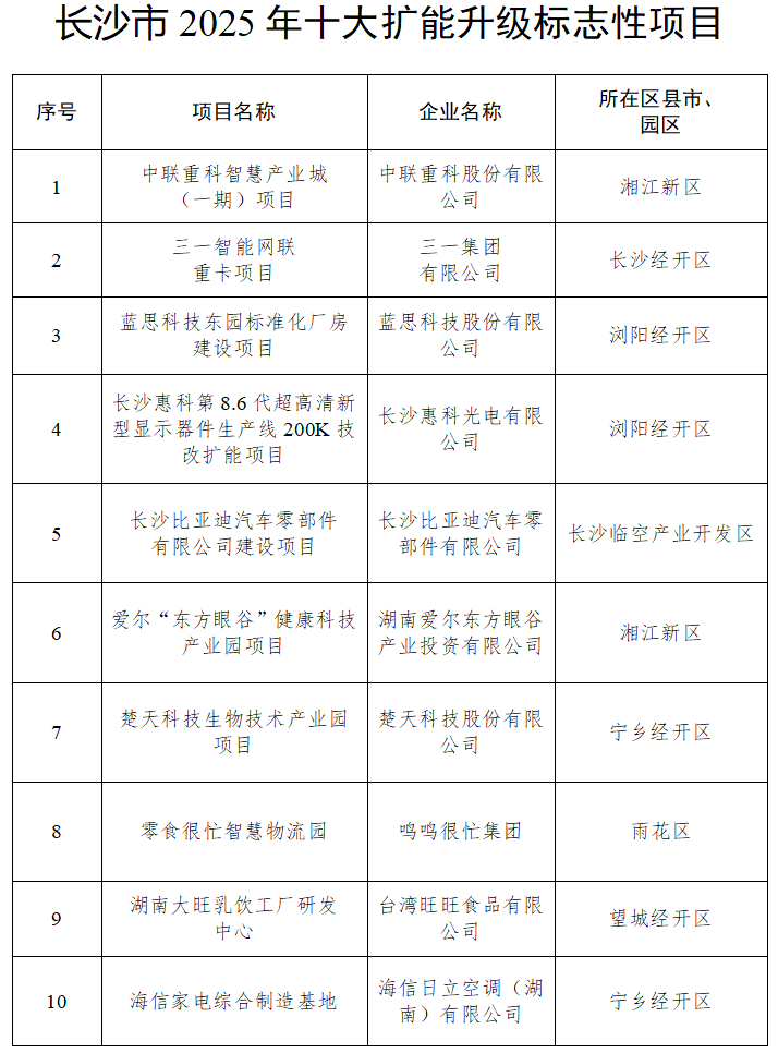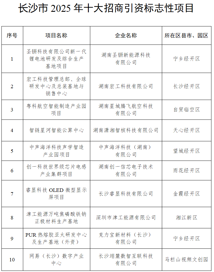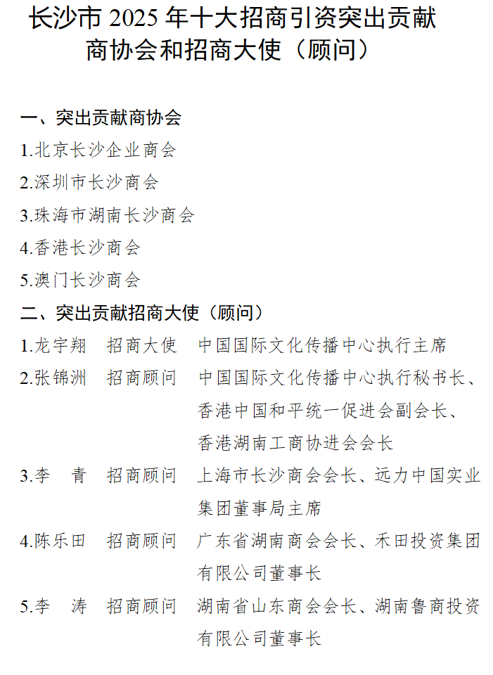湖南日报·新湖南客户端1月15日讯(记者 张福芳 金慧 范远志)1月15日,2026年长沙市招商引资暨优化营商环境大会召开,现场宣读表彰了长沙市2025年十大招商引资标志性项目、十大扩能升级标志性项目、十大招商引资突出贡献商协会和招商大使(顾问)名单。具体名单如下: