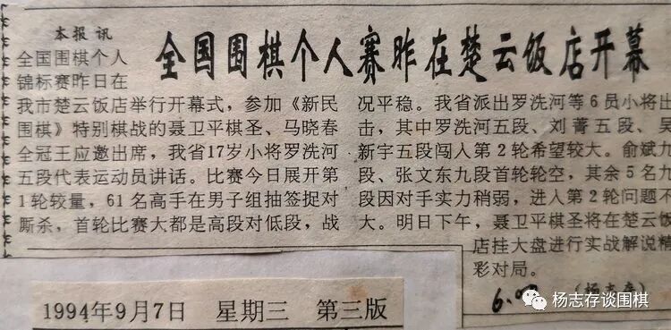 图为9月7日,我发出的消息《全国围棋个人赛昨在楚云饭店开幕》。