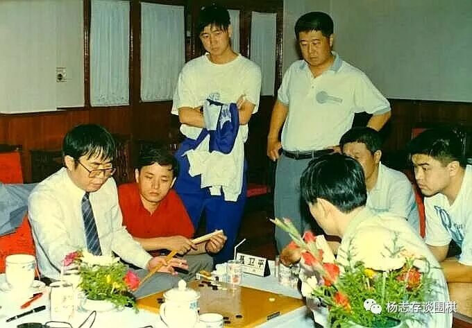 图为聂、马对局结束后复盘,左起:张建东、俞斌、刘思明、罗建文、张文东在围观。