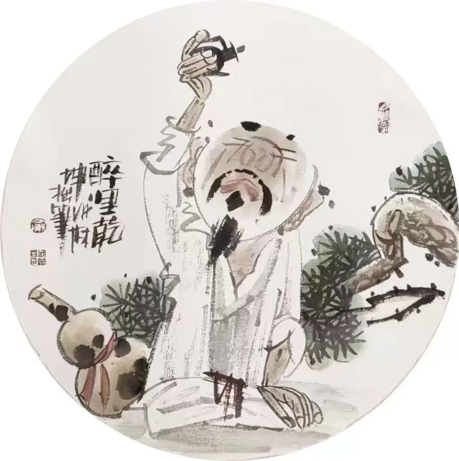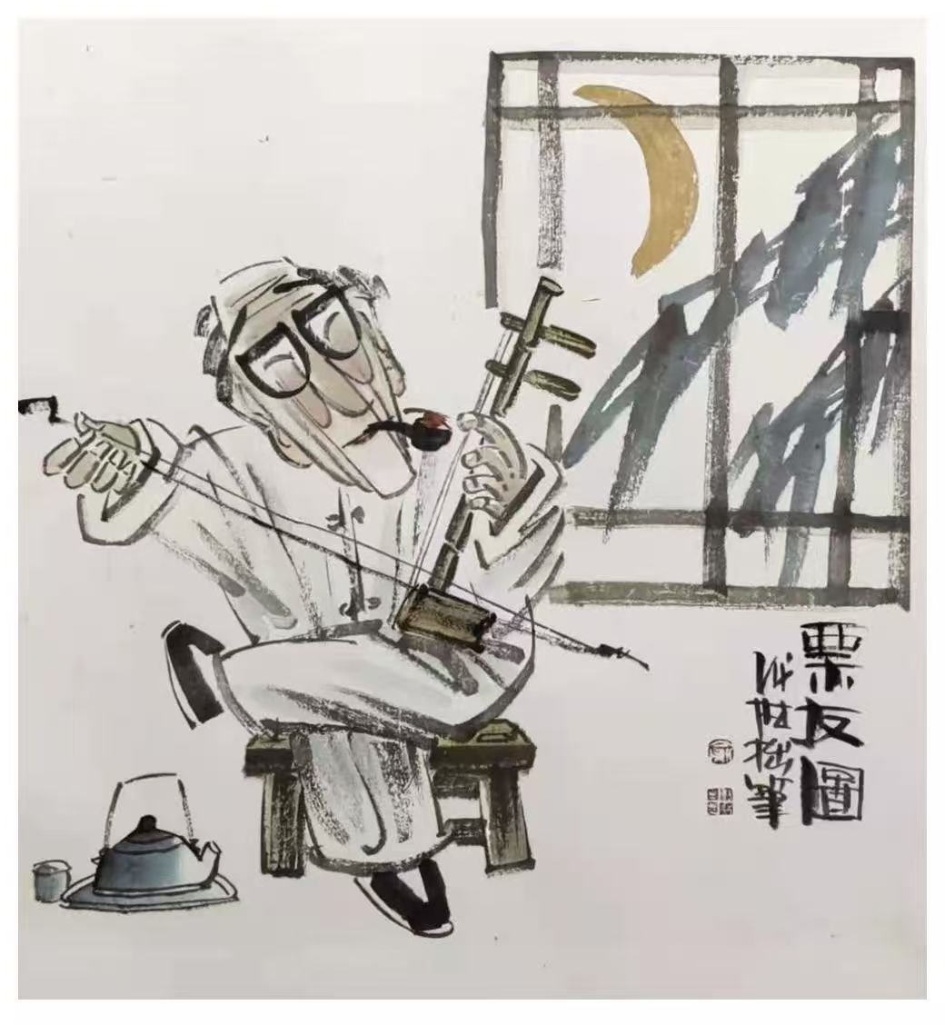 更多时候,我们的交往散落在微信的方寸天地里。他像个殷勤的报喜鸟,时常“通报”艺术上的新动静;有时,又会发来一两个精心淘来的段子,令人忍俊不禁;偶尔臧否人物,笑骂江湖,三言两语间便洒落几点透彻的清醒,与一声温和的叹息。这些零零碎碎的讯息,于我早已超越了寻常寒暄,倒成了我隔着一方屏幕,静静观照他艺术生命流转的一扇小窗。兴之所至,我也会将他发来的那些鲜活素材,随手编排,在“聚宝斋”的抖音号上亮亮相。说来也妙,他那充满谐趣与拙趣的人物画,在短视频光影流窜的世界里,竟如鱼得水,引来不少会心一笑的共鸣。这常让我想起当年主编杂志时,他的作品便是我版面上的常客与亮点。那一幅幅看似漫画笔意的人物,眉眼举止间流转的尽是诙谐,可那诙谐的底子,却透着一股暖融融、活生生的人情味儿,与对世道人心的温柔体察。那并非批判的锋芒,而是理解的微笑;不是孤高的审视,而是从人间烟火深处淬炼出的智慧与慈悲。