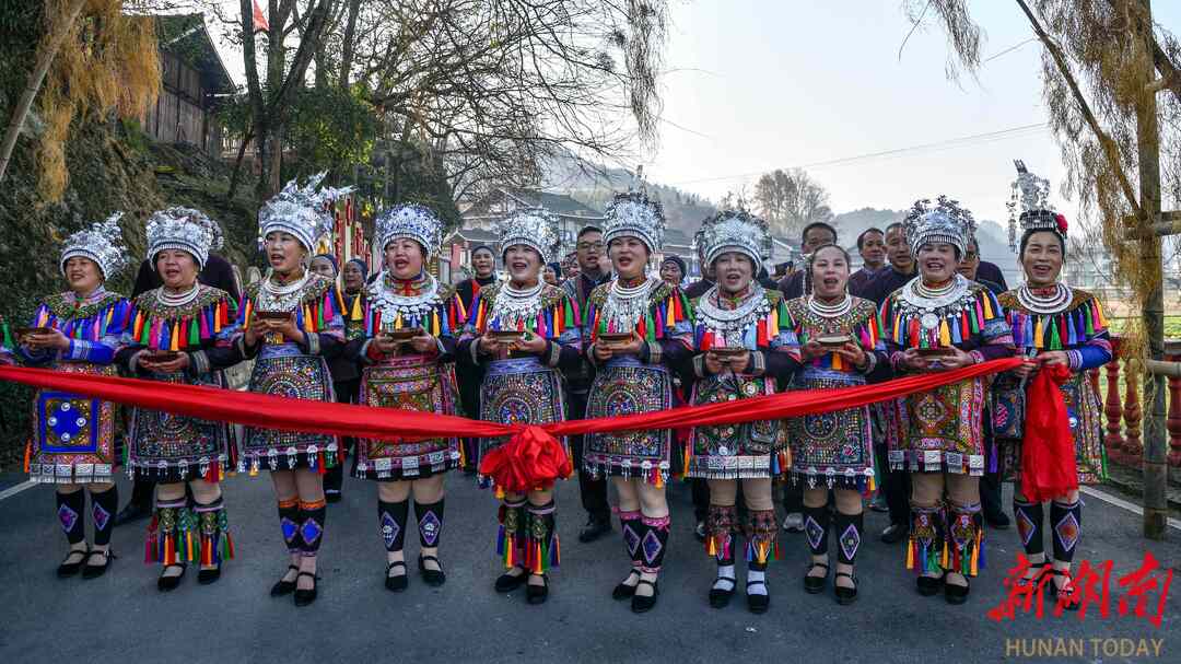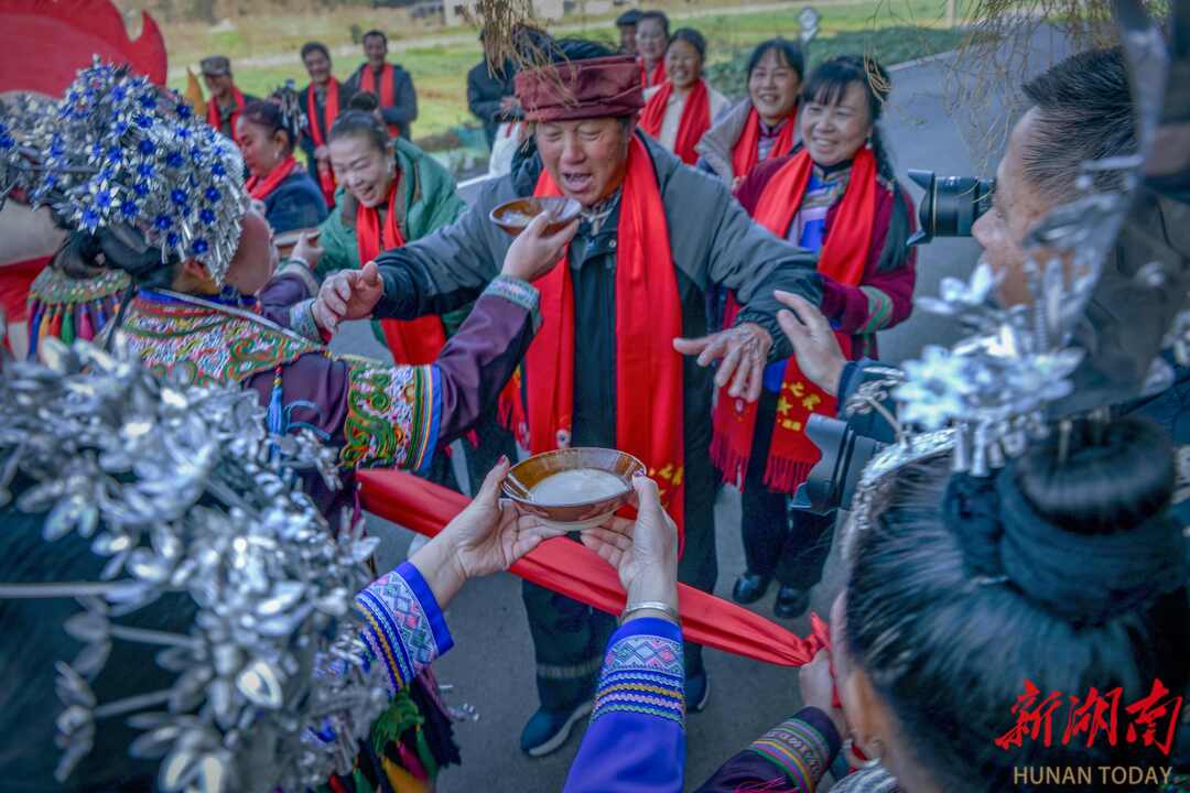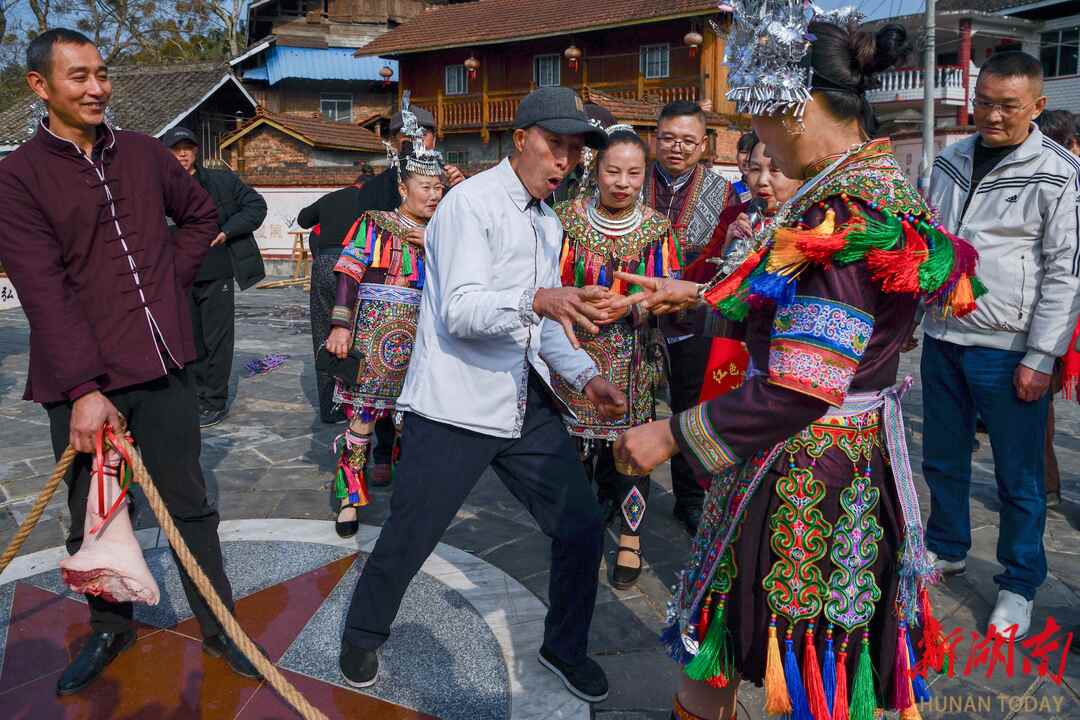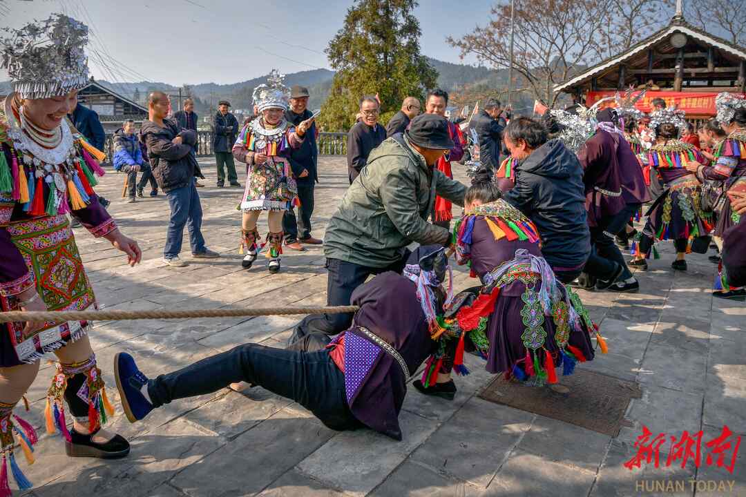 活动伊始,寨门前早已列好盛装的拦门迎宾队。嘉宾至,歌声起,锣鼓鸣,一曲敬酒歌,一盏迎客酒,浓郁的民族风情瞬间点燃现场。广场上,欢声笑语不断:老人们围坐演奏,弦乐声声传递喜悦;青年男女奋力拔河,盛装银饰随动作闪耀;糍粑捶打间糯米飘香,协作中流淌着传统的温度;抢鸭子、骑高脚马等项目趣味横生,引来阵阵喝彩。镜头捕捉到的一张张笑脸——无论是高举猪腿的豪迈,手托礼盘的端庄,还是围观时的专注与欢欣——都汇成了这个冬日最温暖的风景。