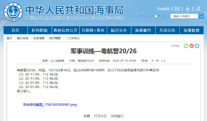 据中国海事局网站消息,江门海事局发布航行警告,1月15日至16日,每日4时至15时,南海部分海域进行军事活动,禁止驶入。