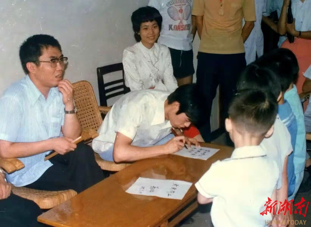 15日,聂卫平、马晓春在长沙休战一天,我抓住机会,组织了长沙市东区少儿围棋班第三期的13名棋童,到位于五一路的芙蓉宾馆,集体看望心中的偶像。聂卫平,马晓春见了棋童们非常高兴,提笔为东区少儿围棋班题词。聂卫平题:“天天向上”;马晓春题:“努力学习 赶超日本 为国争光”,然后他俩与棋童们合影留念。