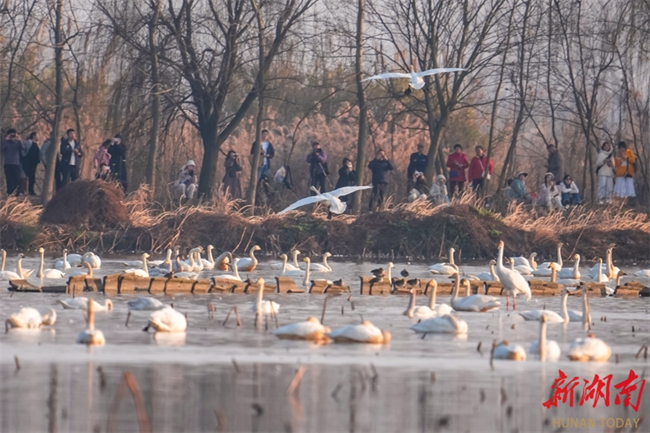 Flocks of migratory birds are seen flying and inhabiting around Donggu Lake in Quyuan Administrative District, Yueyang City on January 11, attracting numerous bird watchers. This winter, the district has rolled out a series of ecological protection measures to continuously improve the ecological environment around the lake area. A large number of migratory birds have been attracted to come here for wintering, making Donggu Lake a famed bird-watching site. (Photo/Song Zhengjun)