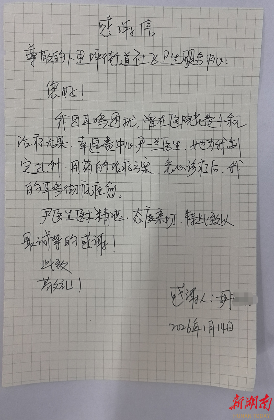 大众卫生报·新湖南客户端1月15日讯(通讯员 王苗)近日,44岁的胡女士将一封手写的感谢信送至郴州市苏仙区卜里坪街道社区卫生服务中心中医科尹一兰医生手中。信中写道:“感谢尹医生用中医的方法治好了我的耳鸣,让我重新睡上了安稳觉,找回了平静的生活。”
