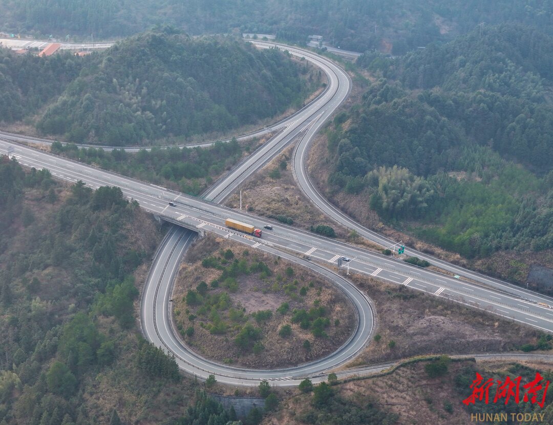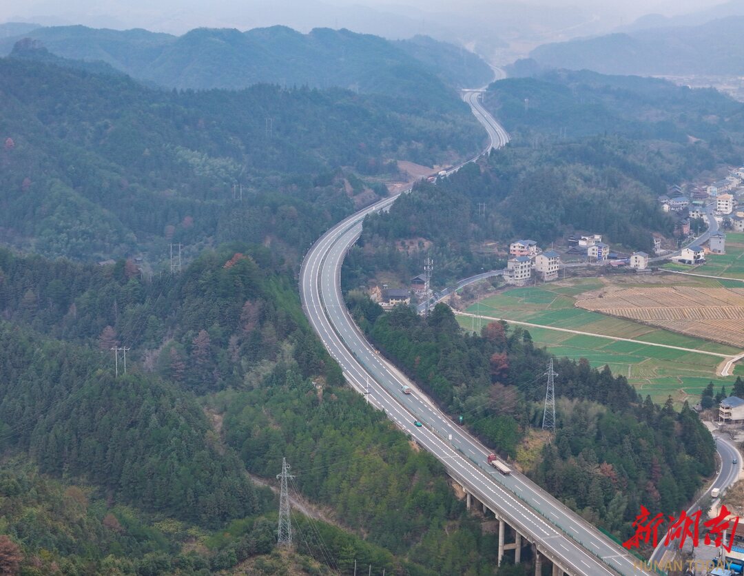 1月15日,怀化市通道侗族自治县陇城镇,G65包(头)茂(名)高速公路蜿蜒在青山翠谷间。近年来,该县着力推进交通路网与乡村产业发展有机融合,铺就产业振兴“快车道”。李尚引 摄(湖南图片库)