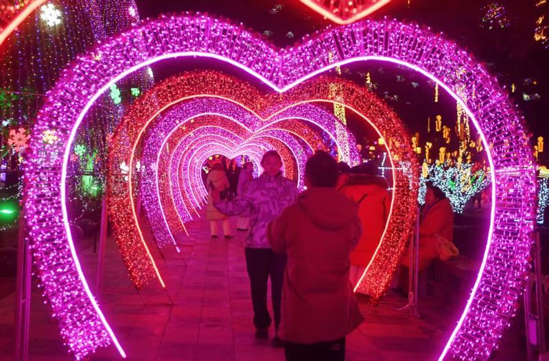花灯展区则是传统年味的集中承载地。18组大型主题灯组搭配180件精巧小型花灯错落分布,以生肖贺岁、神话传说、吉祥寓意为主线,《四龙戏珠》《百鸟朝凤》《龙凤呈祥》《丛林派对》等流光溢彩的灯组,将浓厚的喜庆年味儿洒满整个峡谷。