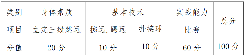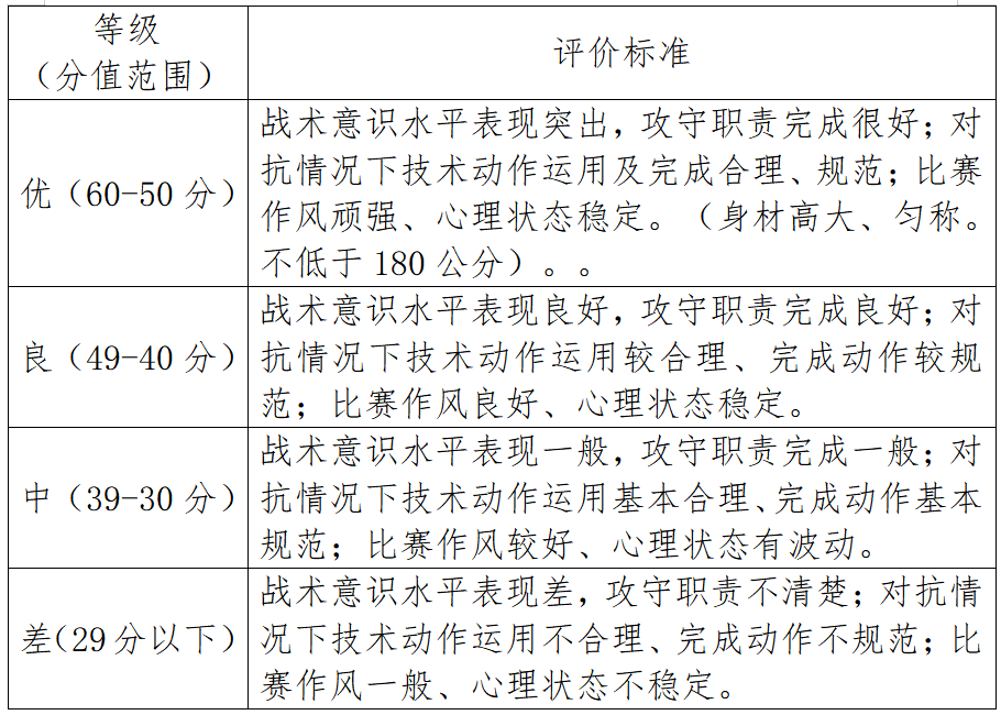 队员最终成绩=身体素质成绩+基本技术成绩+比赛成绩。如遇总分相同,则按照以下先后顺序进行排名:比赛成绩——基本技术成绩 ——身体素质成绩。