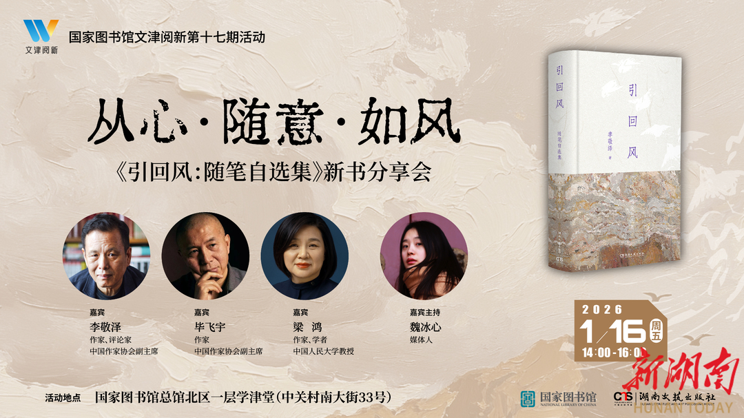 湖南日报·新湖南客户端1月15日讯(记者 黄煌)从心,随意,如风,不仅是一种理想的生命状态,更是无数写作者所追寻的创作境界。1月16日下午2点,从心,随意,如风——《引回风:随笔自选集》新书分享会将在国家图书馆举行。