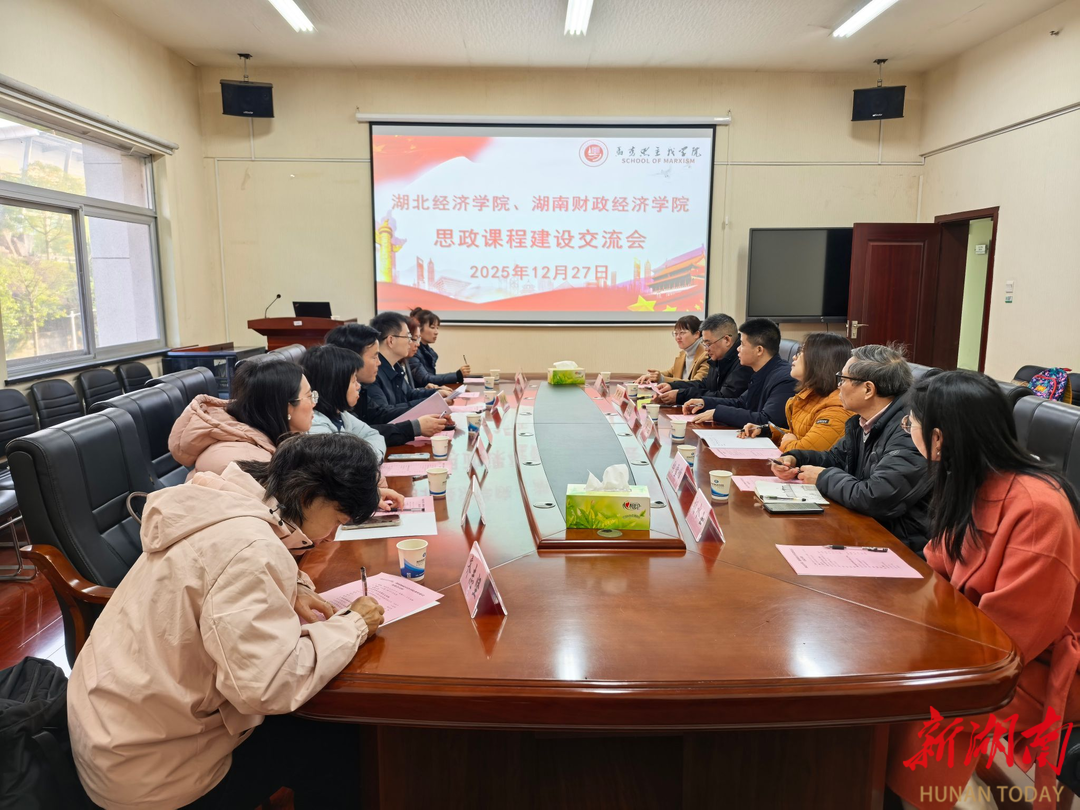 近日,湖北经济学院代表来湖南财政经济学院交流思政课程建设。马克思主义学院党总支副书记游志能、中国近现代史纲要教研室主任、形势与政策教研室主任及相关教师代表参加交流会。